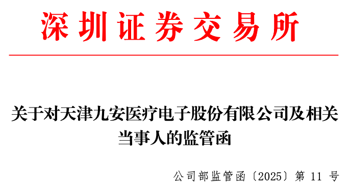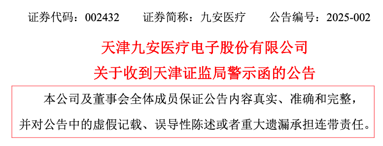 1月24日晚间,九安医疗(002432)发布公告称,公司于当日收到天津证监局下发的《关于对天津九安医疗电子股份有限公司、孙喆采取出具警示函措施的决定》。